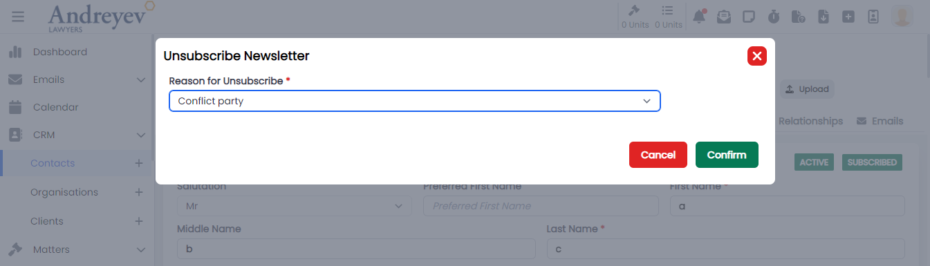 This is a modal using modalform to customise for unsubscribing newsletters for a contact providing reasons.