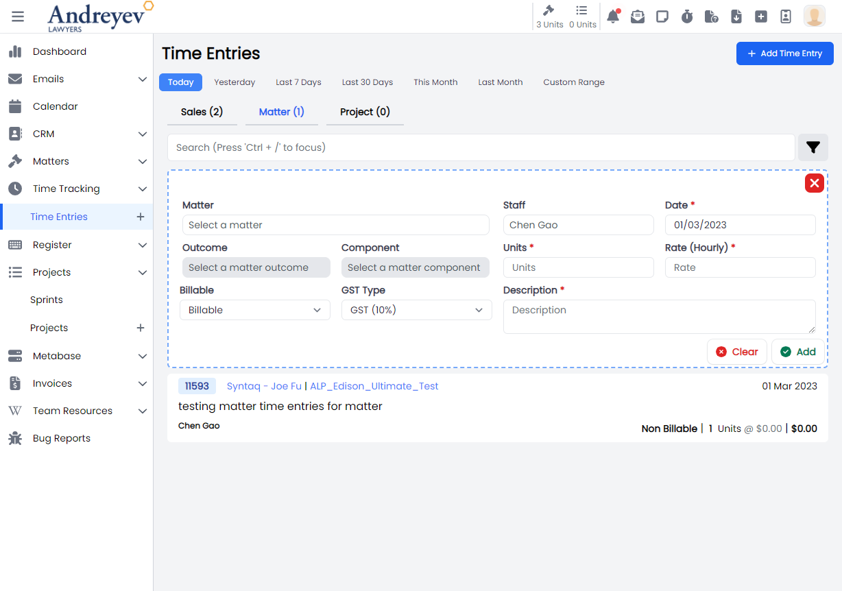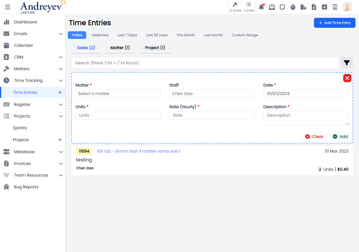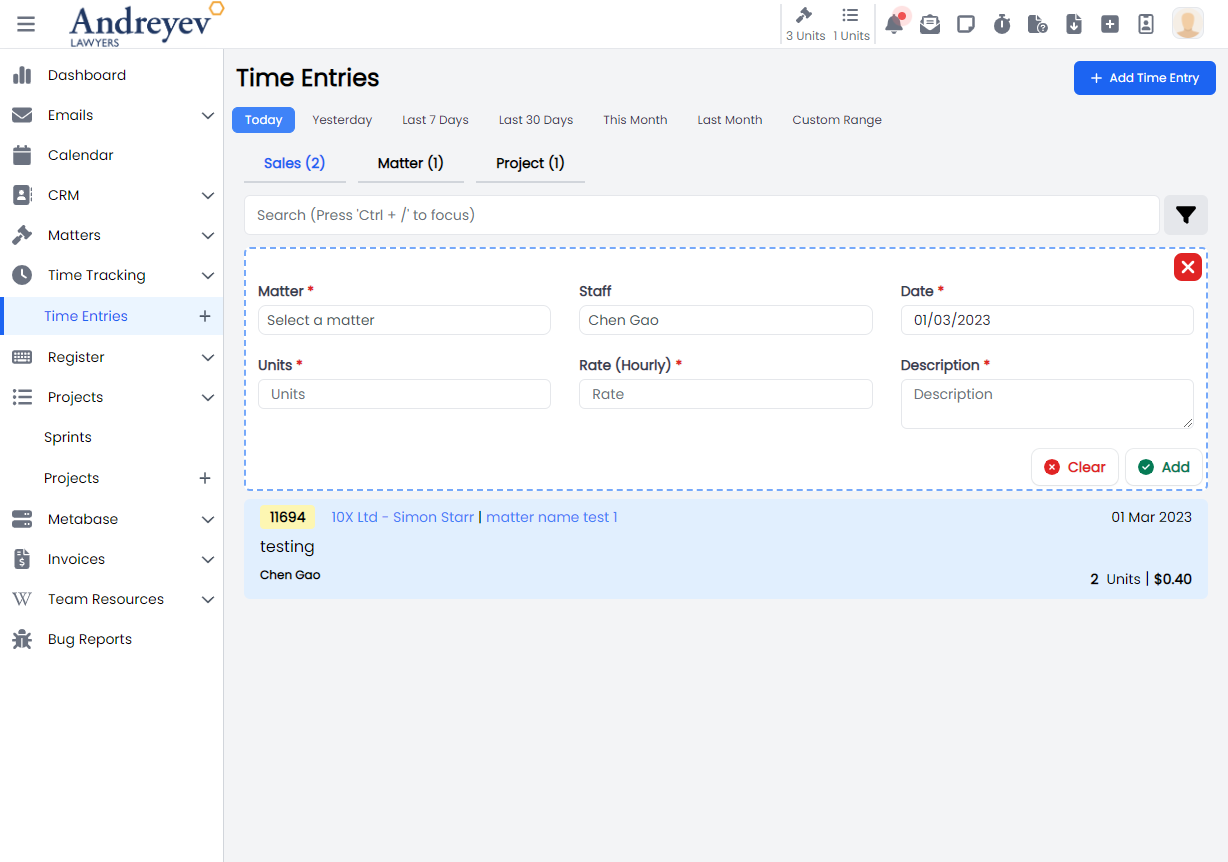 This component renders each inline matter time entries under "Time Tracking" > "Time Entries" > "Sales" section.