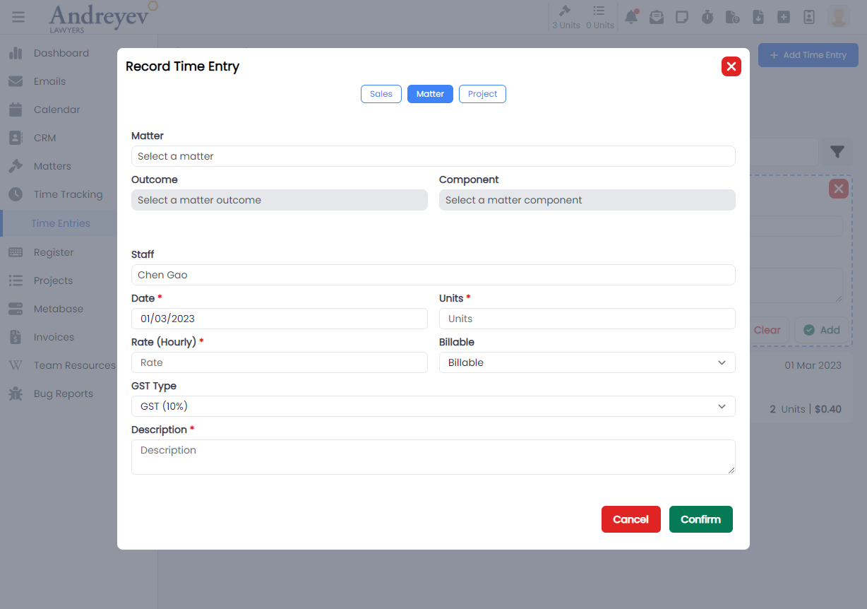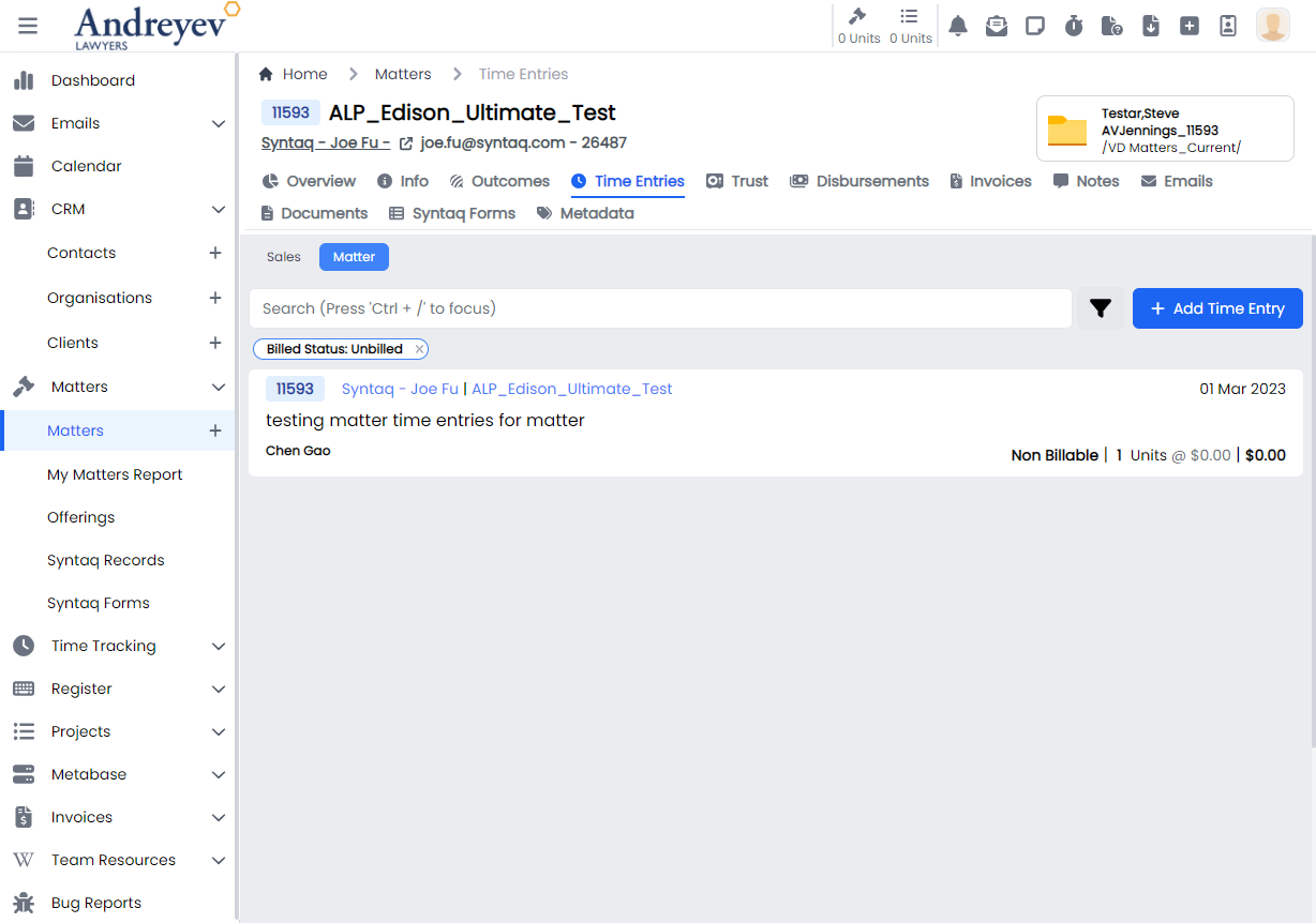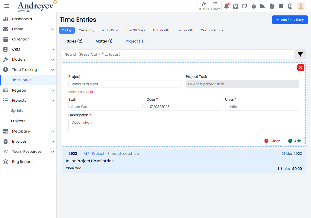 This component renders each inline matter time entries under "Time Tracking" > "Time Entries" > "Sales" section.