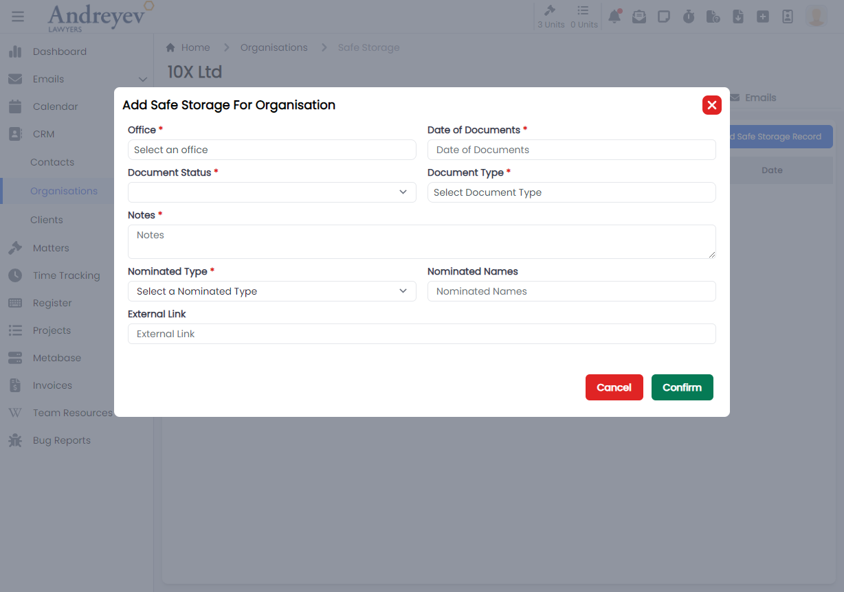 This component renders a modal using modalform, for creating a safe storage for an organisation.