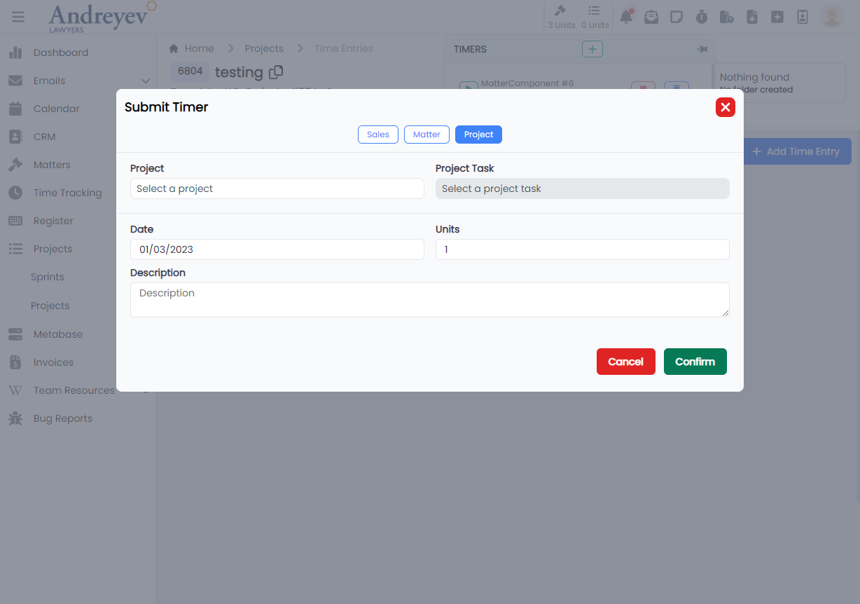 This component consists of the form to fill for CreateTimeEntryForMatter using the modalform component. This component consists of both forms for matter and for sales.
